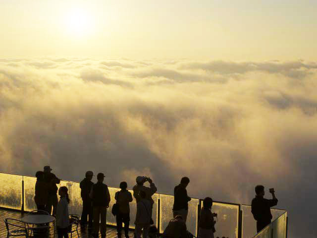 雲海をゴンドラに乗って見に行くことができる「雲海テラス」。30~40%ほどの確率で発生する貴重な自然現象である雲海を、さまざまな展望スポットから楽しめます。条件の揃った早朝にしか見られない一期一会の絶景です!