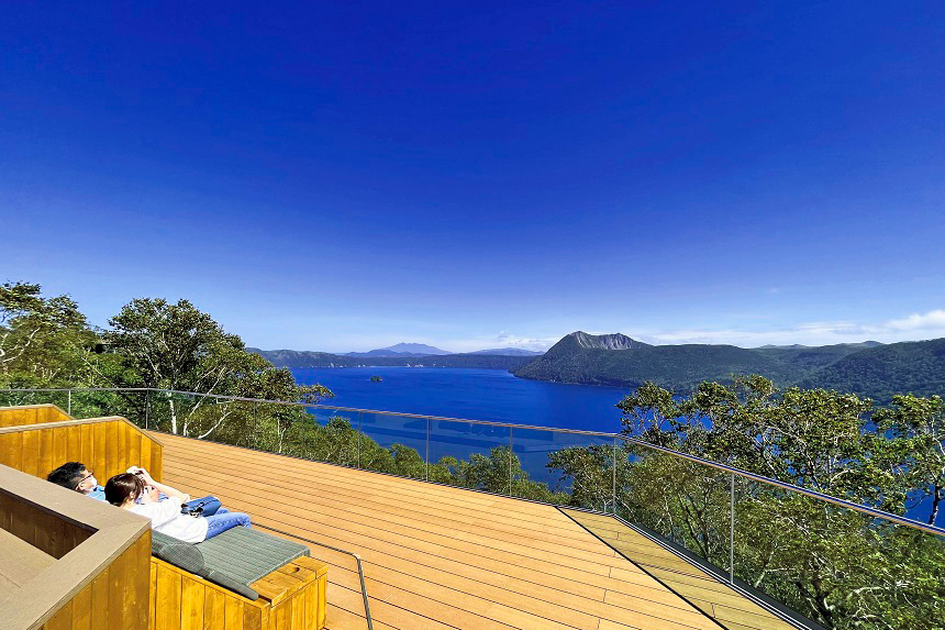 摩周湖第一展望台にある摩周湖レストハウスが2022年にリニューアル。ウッドデッキにあるソファでくつろぎながら摩周湖を眺められます。周辺にある3つの展望台のなかでも景色がひときわ美しい展望台です。真正面に見えるのは摩周岳。夜の星空も最高です。