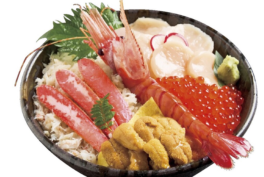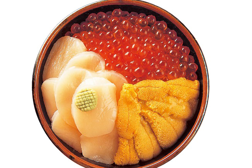 写真の「巴丼」は特製のイクラ醤油漬、無添塩水の生ウニ、朝むきたてのホタテがのった、三色海鮮丼の元祖です。