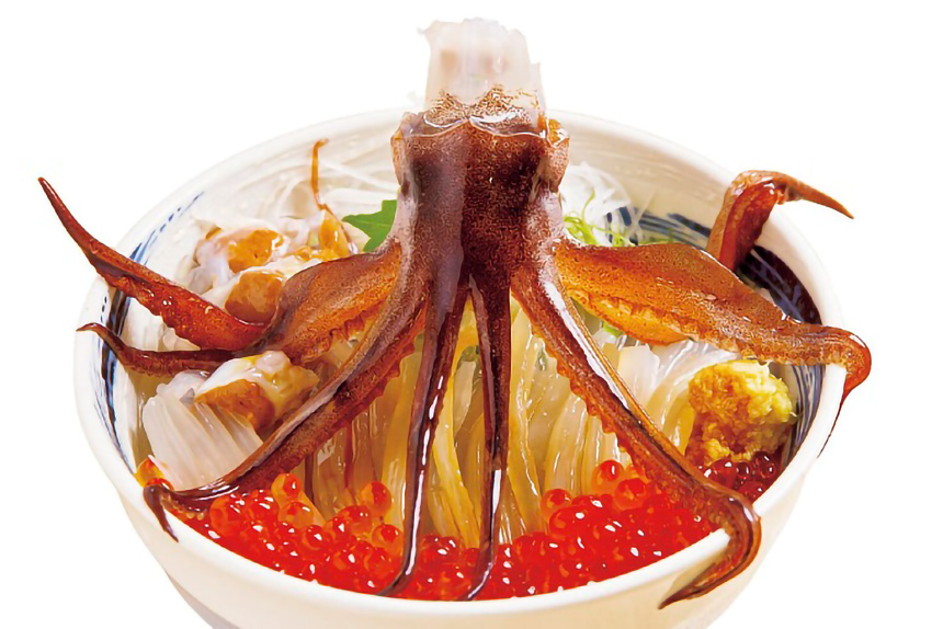 生けすの活イカを使った「活いか踊り丼」(写真)は、イカゴロ(6~12月のみ)を潰しながら身と一緒に食べると美味。不漁、時化により活イカの入荷がない場合があるので要確認。