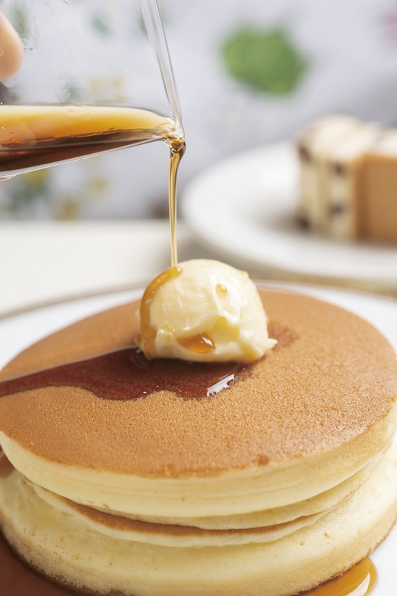 裏表と間にもバターがたっぷりのホットケーキ(写真)は、6等分してメープルシロップをかけて召し上がれ。