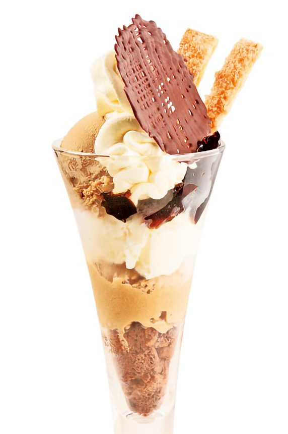 写真の「スノーロイヤルエスプレッソパフェ」は、伝統あるスノーロイヤルアイスとビターなエスプレッソアイスを使用した人気のパフェ。