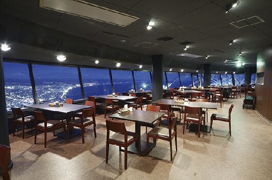 有珠山ロープウェイ山頂駅の洞爺湖展望台にあるテラス。ソファとカフェがあり、景色を眺めながらゆったりとした時間を過ごすことができます。洞爺湖を一望するダイナミックな大自然を体感しましょう!