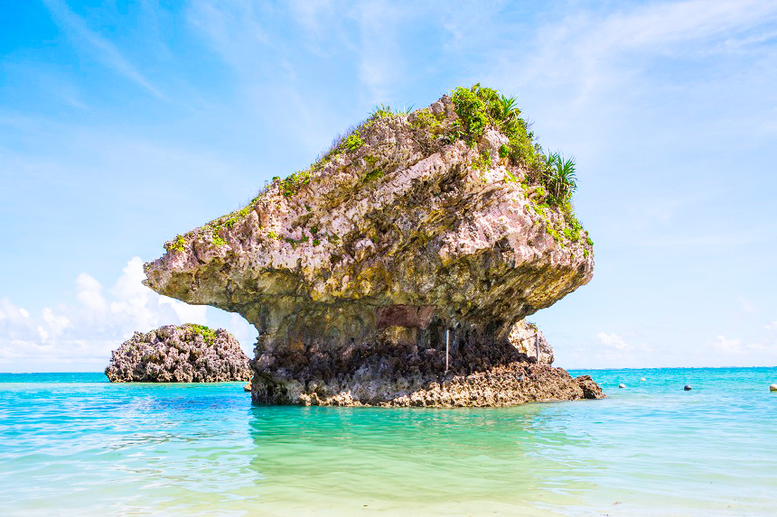 砂浜が2kmも続く遠浅の海岸に、浸食で残された岩が点在する天然ビーチ。サンゴ礁を周遊するグラスボートも運航しています。