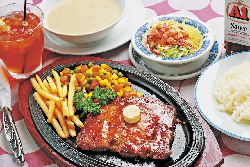 1967年の創業当時と変わらないスタイルを貫くドライブインレストラン。すべて持ち帰りができ、テイクアウトコーナーは24時間営業。ステーキや洋食、定食など幅広いメニューがあります。なかでも人気なのが鉄板で供されるリブステーキ。スープやサラダ、ライスまたはパンが付きます。