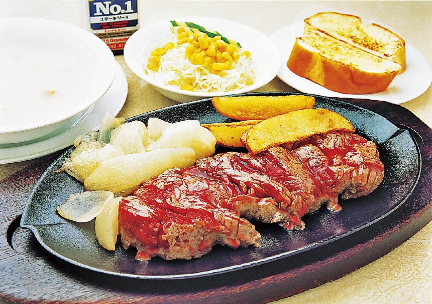 1953年創業の老舗。酸味のあるオリジナルソースが肉のうまみをひきたてます。好みの焼き加減で出してくれるテンダーロインステーキはスープ、サラダ付き。電話予約はできませんが、混雑状況は入口の上にあるランプの色で確認できます。