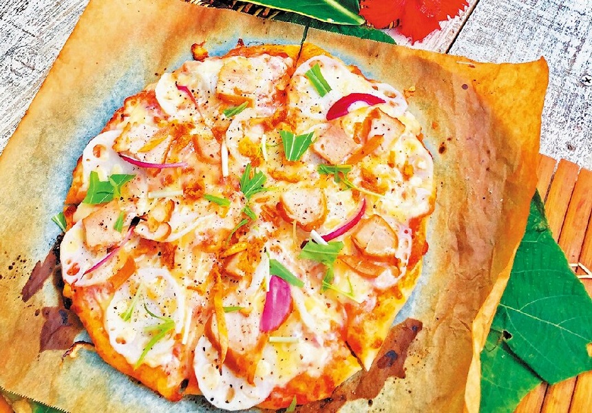 レンコンとスモークチキンピザ。とろけるようなチーズと、シャキシャキれんこんがマッチ