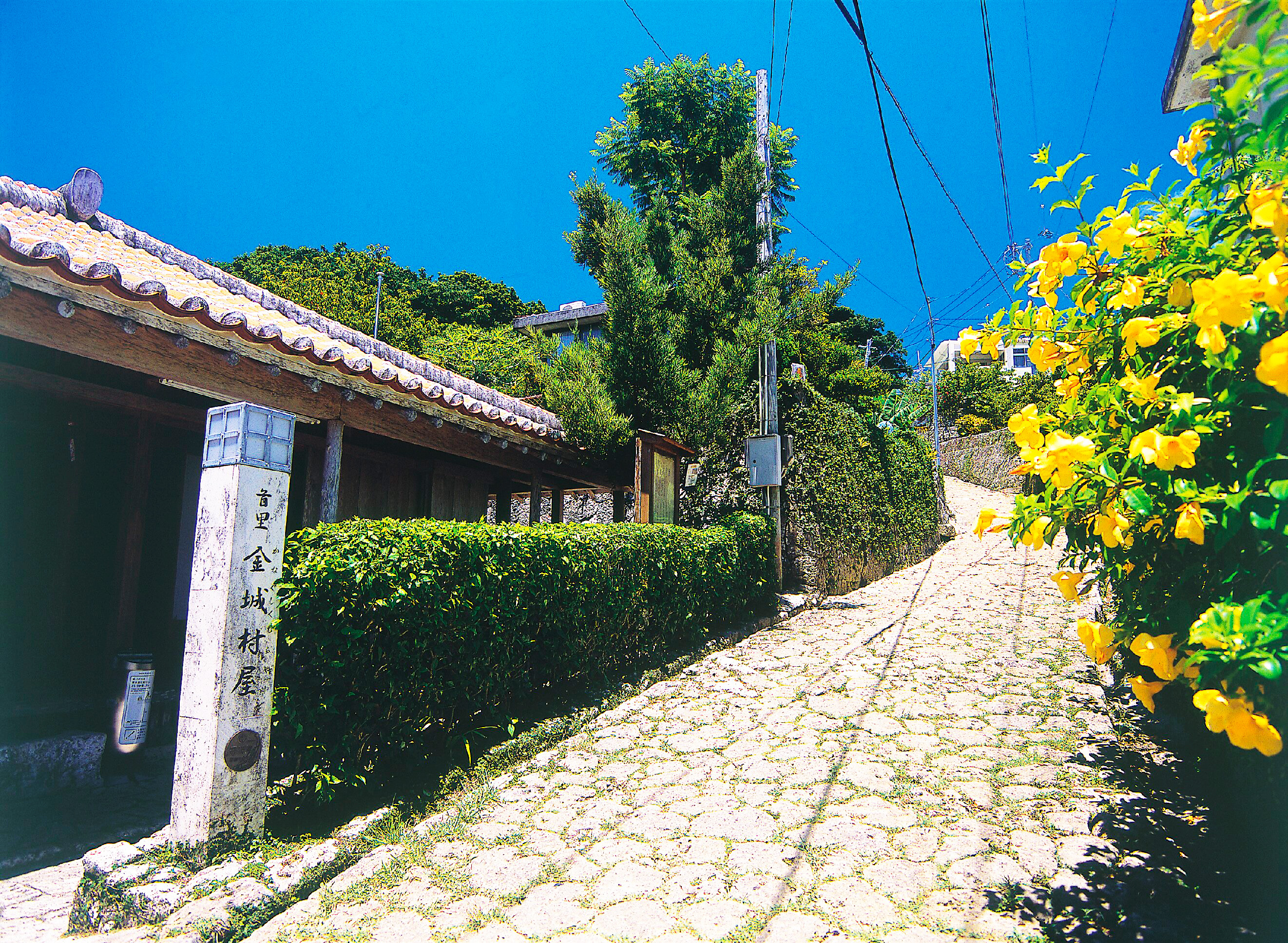 1522年頃に築かれた約10㎞の道のうち、戦禍を逃れたわずか300mほどが現存しています。道の両側には古い石垣や赤瓦の屋根の家々が続き、琉球石灰岩をモザイクのように敷き詰めた古道は風情たっぷり。