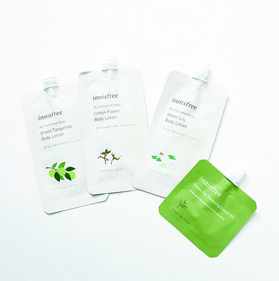 ナチュラルコスメブランドの「innisfree」は、スキンケアアイテムが豊富。パウチに入っているのは旅先にもおすすめです。