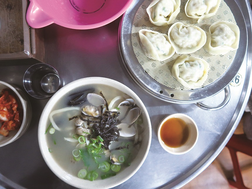 旅先のひとりごはんで参考にしているミシュランガイドのビブグルマン。宿近くで探したカルグクス(韓国式うどん)の専門店「チャニャンチッ」へ。メニューはカルグクスとマンドゥ(肉餃子)のみとのことで、もちろん2種オーダー。うま~い。満腹&満足。