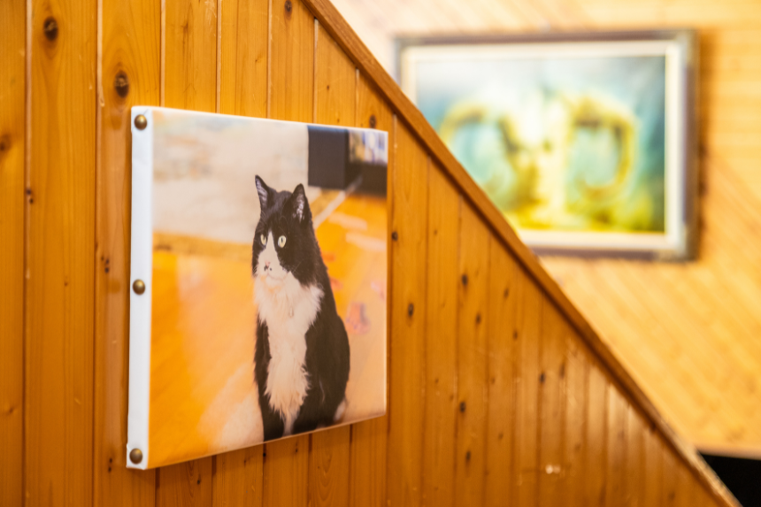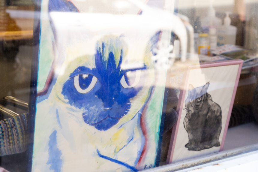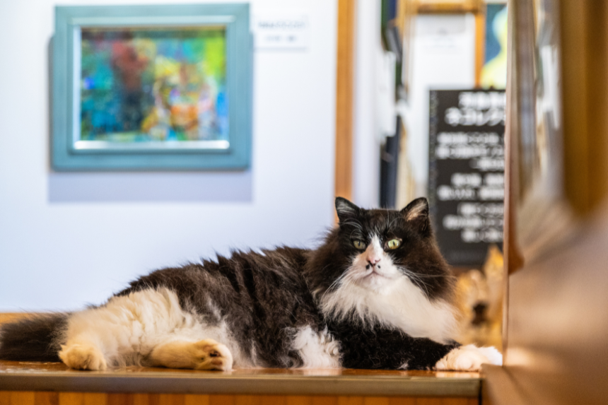 看板ねこさんにも会いに行きました。マスクくんが住んでいるのは、なんと美術館。館長さんがえさをあげているうちに居つくようになり、今では堂々とした佇まいのミュージアムねこです。