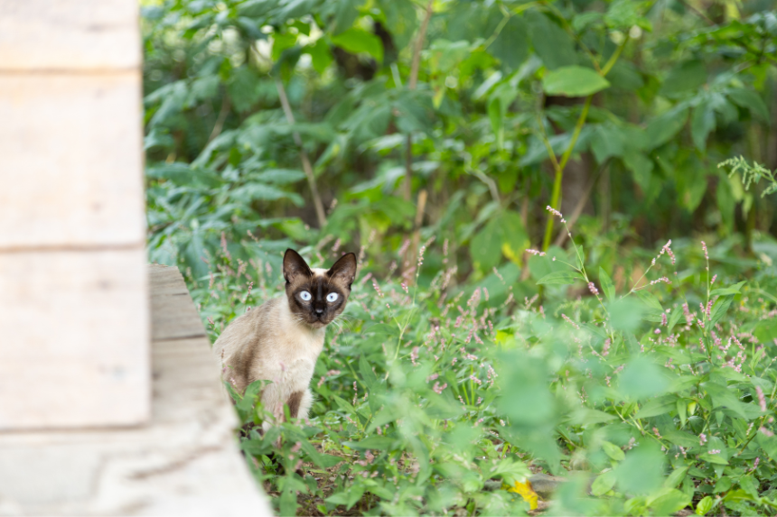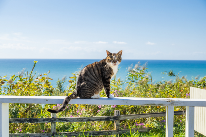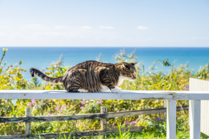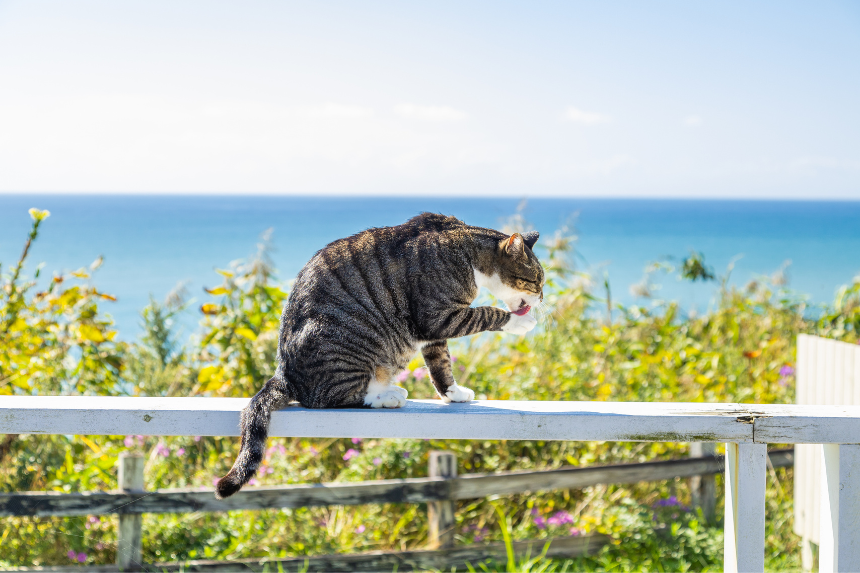すぐに撮影を始めたいところですが、取材陣、焦る心を落ち着かせます。時間をかけ、ねこの警戒心が取れるのを待つのです。動き出してくれたら、今度は撮影場所のテラスに来てくれるまで待ちますよ。