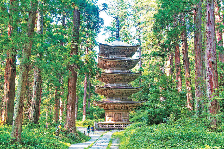 開山以来1400年もの歴史を誇る、羽黒山、月山、湯殿山からなる「出羽三山」。その中心的な存在・羽黒山には、出羽三山の三柱の神を祀る羽黒山三神合祭殿があります。ここへ参れば三神をお詣りしたとされる三神合祭殿は、日本最大級の大きさを誇る茅葺き屋根が特徴。五重塔は東北最古の塔ともいわれています。