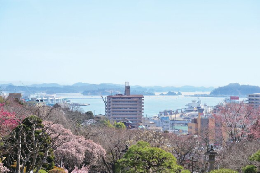 境内からは塩釜港が望めます。鹽竈ザクラの見頃は4月下旬頃から。