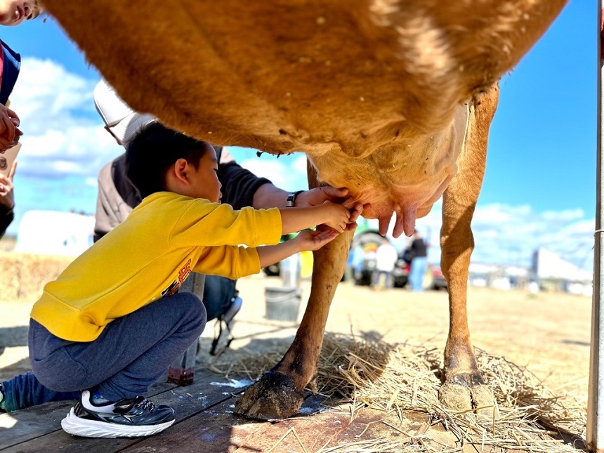 須藤牧場の牛が来園し、乳搾り体験が