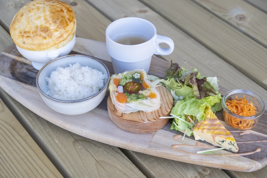 ダイニングのメインとなるのが、袖ケ浦で人気のカフェが南房総地域に初出店した「のうえんカフェ 館山」。野菜たっぷりなプレート料理がそろうほか、ジビエの猪肉を使ったメニューもおすすめです。