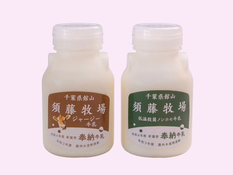 2種類ある須藤牧場の牛乳も販売。低温殺菌ノンホモ牛乳(右)ミニサイズ280円~/低温殺菌ノンホモ ジャージー牛乳(左)350円~