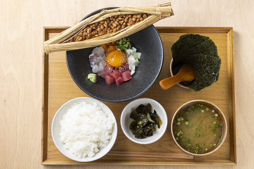 下妻産大豆100%の納豆や海鮮がセットになった、海鮮ばくだんねばねば定食1580円