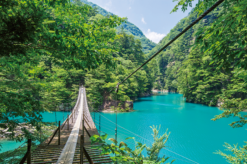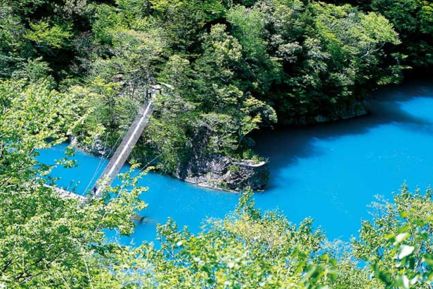 南アルプスの山々に抱かれた、美しい寸又峡。吸い込まれそうな青い色の湖に架けられた夢のつり橋が、今、大人気です。6月は、新緑のグラデーションとコバルトブルーやエメラルドグリーンの湖面を見ることができる絶好のタイミングです。