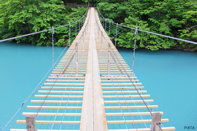今月は、コバルトブルーの湖がひときわ目を引く吊り橋です。静岡市内から車で2時間ほど走った南アルプスの寸又峡にある「夢のつり橋」。幅は人ひとり分。秘境感たっぷりの絶景吊り橋です。