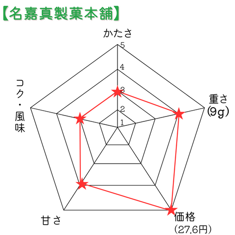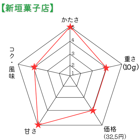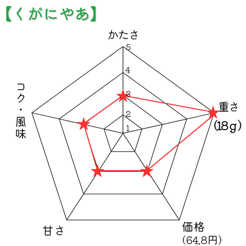 かたさ、コク・風味、甘さ、価格、一個あたりの重さの5項目について、それぞれを比較しています。
