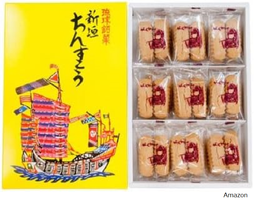 ギザギザがない丸みを帯びた形で、さくさくほろり、ほどけるような食感のちんすこうです。新垣菓子店とパッケージが似ていますが、守礼門が描かれているのが名嘉真製菓本舗のちんすこうです。