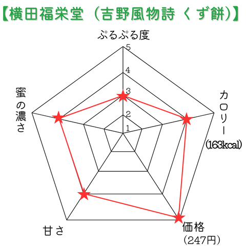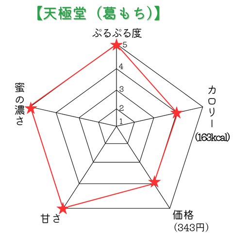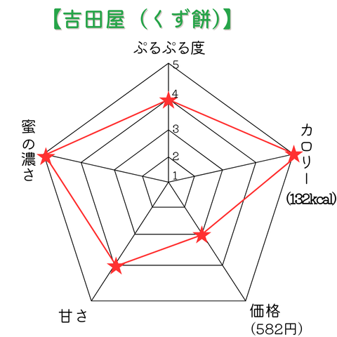 ぷるぷる度、黒蜜の濃さ、甘さ、100gあたりの価格とカロリーの5項目について、それぞれを比較しています。