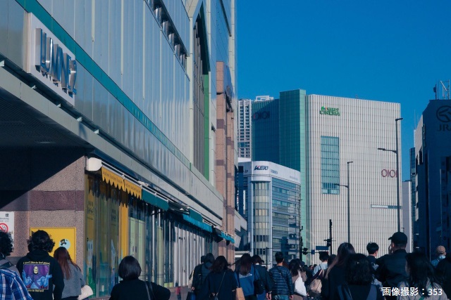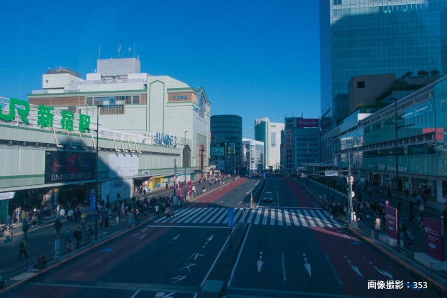「新宿駅南口」を出て、おしゃれなマカロンの積まれたショーウインドウを背に飛び出した先は、「ルミネ2」の前から「新宿マルイ アネックス」などをのぞむ歩道。