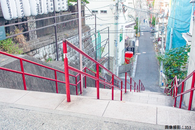 「須賀神社」を目指して歩くと案外迷うかもしれないので、「須賀神社男坂」を目指すのがおすすめです。あの「赤い手すり」が見えたときの感動はひとしおですよ!