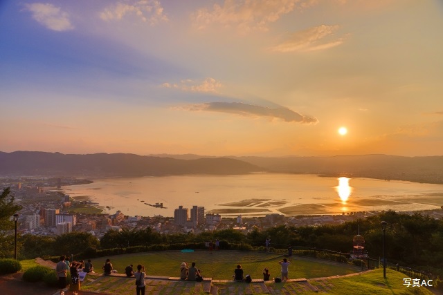 諏訪湖周辺のエリアで特に人気なのが「立石公園」からの眺め。「かたわれ時」の再現をするファンが沢山訪れたようです。