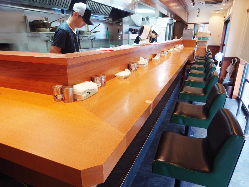 店内は厨房を囲むL字型カウンターに12席。卓上には味変に嬉しい一味唐辛子とコショウのほかにティッシュペーパーが用意されています。