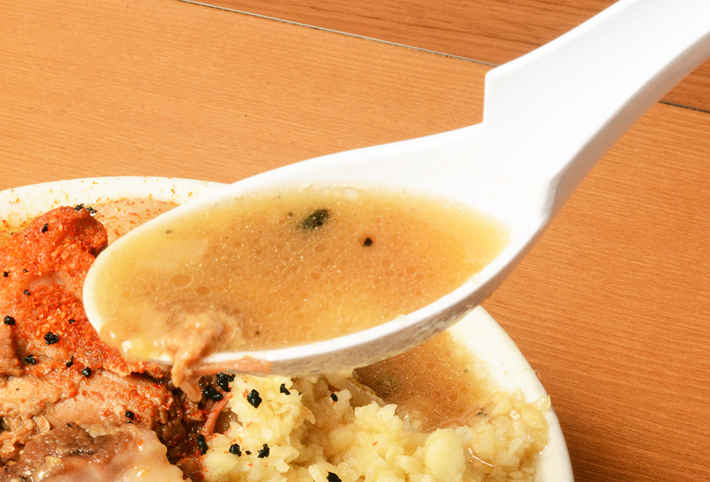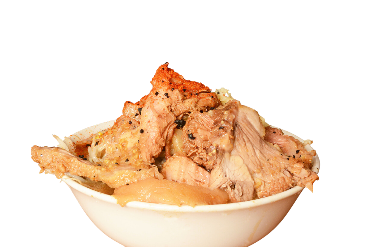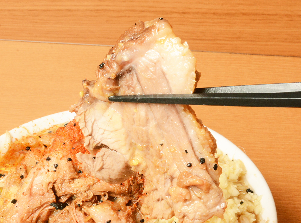 もちろん高く積みあがるシャキシャキとした食感を残したヤサイとも相性抜群!そして暴力的と言っていいほどたっぷりとトッピングされた豚は見るだけでも食欲をそそります。