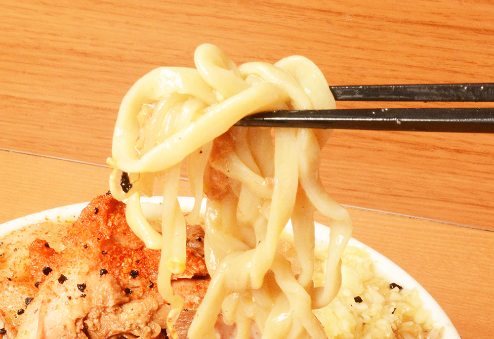 重厚な旨味を生み出す豚骨ベースにキリっとしたカエシの塩味がパンチになっている乳化スープ。とろみを感じさせるほどの濃厚なスープから感じる豚の旨味は都内の二郎系ラーメンの中でも屈指のインパクトを誇ります。