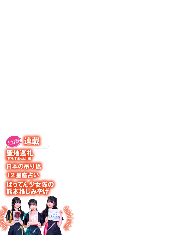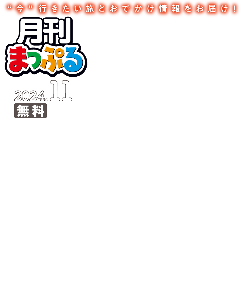 巻頭特集 ライトアップ&特別公開情報秋の京都 紅葉最前線 いい夫婦の日に行って円満HAPPYに!日本の縁結びスポット ソウルで市場の必食メニューを食べ尽くし 連載コラム 【連載】ばってん少女隊が選ぶ!熊本みやげ 全国ご当地推しみやげ 【連載】あのシーンをリアルで感じる聖地巡礼トリップ『耳をすませば』編 【連載】絶景への架け橋!一生に一度は渡りたい吊り橋 もみじ谷大吊橋 ー 栃木県那須塩原市 【連載】総合運とラッキーおでかけ先を知ってもっとハッピーに!まっぷる12星座占い 2024年11月の運勢 誌面内イラスト:川瀬ホシナ