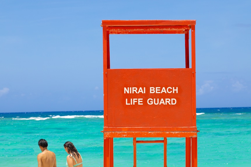 '80年代ポスター風で赤と海の青、ビーチの白と色のコントラストが美しい沖縄県読谷村の「ニライビーチ」の写真を中心に、カラフルな南国スイーツの写真や沖縄の夕陽スポット、沖縄取材の裏話をお届けします。