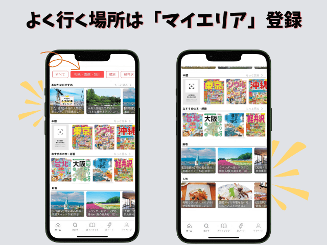 あとは、マイエリアのボタンをタップするだけで、目的地のおすすめ、人気、最新の情報がすぐ見つかります。