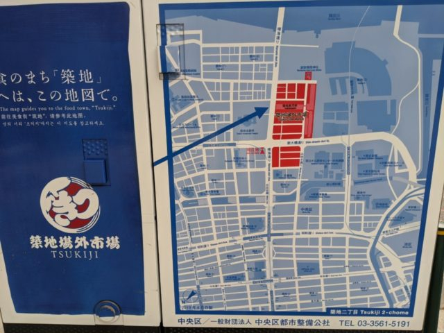 現地にはわかりやすい看板が。新大橋通りと晴海通りに囲まれた赤の範囲が築地場外市場の主要エリアです。