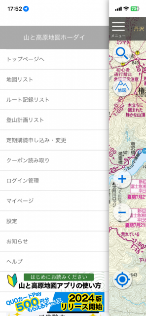 『定期購読を行う』をタップし、会員登録を済ませたら『メニュー→地図リスト』をタップします。