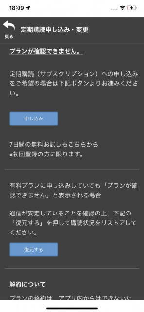 ダウンロードしたての状態では機能制限がかかっていますので、『定期購読申し込み・変更』より購読の手続きを済ませてください。