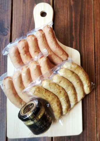 2019年ドイツ国際食肉業専門見本市金メダルを受賞した、粗びき、チーズ、ガーリックの3品をオランダ産のマスタードと一緒に。