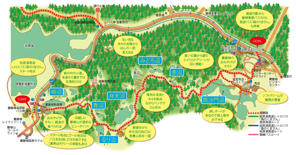 - JR磐越西線猪苗代駅から磐梯東都バス裏磐梯高原駅行きで35分、五色沼入口下車すぐ