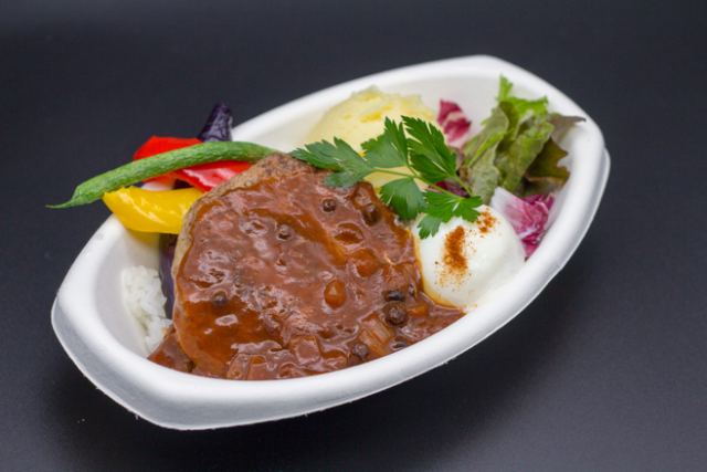 まきばレストランおすすめのテイクアウトメニューは、1日20食限定の「甲州ワインビーフ ロコモコ丼」。山梨県産のブランド牛「甲州ワインビーフ」を100%使用したハンバーグはジューシーな肉質で、やわらかい食感が楽しめます。