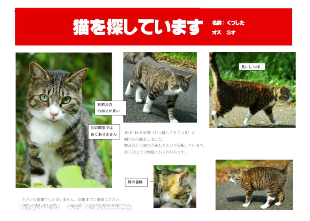 まだご近所さんに引っ越しの挨拶すらしていないのに、奥さんは迷子猫のチラシを作って向こう三軒両隣だけでなく辺り一帯にそれを配って回ったのでした。