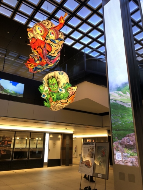 取材時、デジタルサイネージ「モノリス」の横には 吊りねぶた「風神雷神」の姿も