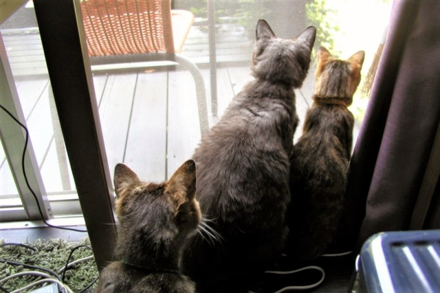 庭に誰かがいると気になってしょうがない猫たち。そのうちゾロゾロと駆け出していきます。
