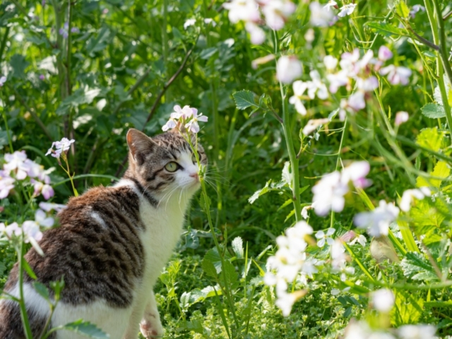 島では春の花が咲き、ねこたちも何だかうきうきしているように見えます。