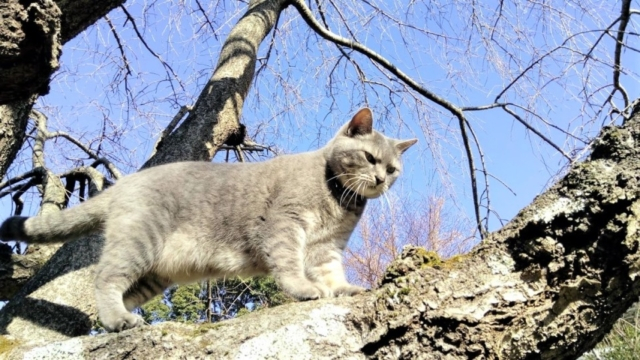 桜の下でちーも冬毛が抜け始めて春の装いです