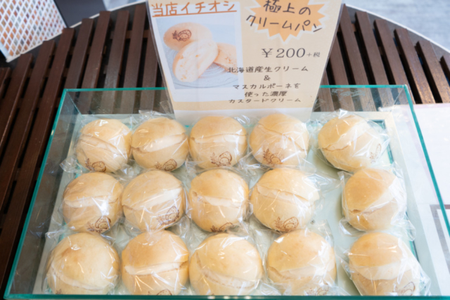お店イチオシのパンは、その名も「極上のクリームパン」こだわりのパン生地に、濃厚なカスタードクリームが合わさって、極上の逸品。北海道産の生クリームとマスカルポーネを使用したカスタードクリームは、甘みとコクを存分に感じられ、それでいて、軽やかな舌触りのクリームに仕上がっています。口の中に広がる繊細でまとまったおいしさは、まさに「ほっぺたが落ちる」という表現がぴったりです!