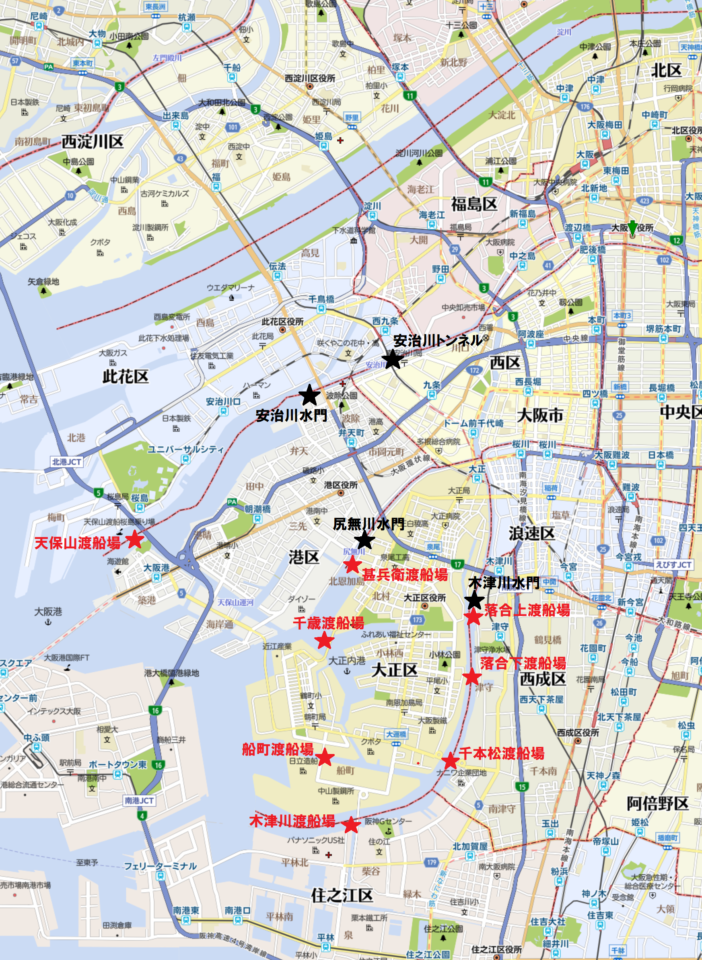 大阪市の渡船は、港区、大正区、西成区、住之江区の4区にまたがる港湾エリアに点在し、大川(旧淀川)から派生した、安治川・尻無川・木津川の3川を主に渡すために設置されています。