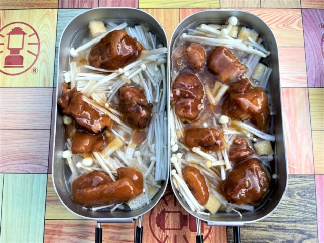 メスティン1個に入りきらないので、材料を半分ずつにして調理します。